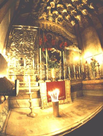 The main intrance (see picture 186 above) is in the southern courtyard, accessable from Christian Quarter Road or Dabbaga Road of Shuk Khan ez - Zeit. The church is a conglomeration of chapels and alters and Stations of the Cross. Once in the church, the Anointment Stone is the first Holy site you come to. The reddish-brown limestone slab is regarded as the place where the body of Jesus was anointed before he was entombed. Underneath the Golgotha chapel is the Greek Orthodox Chapel of Adam, where a skull was found here, and the claim is that it's the skull of Adam.