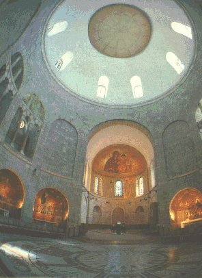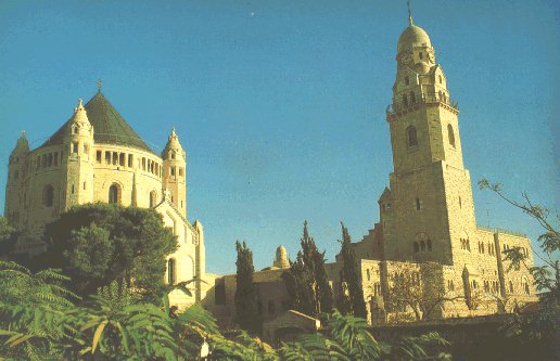 The Basillica of the Dormition marks the site where the Virgin Mary died, on Mount Zion. In 1910 the Benedictione Fathers built the present church, the site the Basilica was given by the Turks in 1898 to the German Emperor Wilhem II, who gave it to the Benedictine Fathers. The apse of the church is decorated with a beautiful mosaic of Mary and the Child, In the crypt is a stone effigy of the virgin Mary asleep on her death bed.
