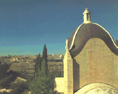 200 = Partial view of the Old City with its eastern wall, the Dome Of the Rock, Al-Aqsa Mosque and Mount Zion with the Church of the Dormition. On the right is the Chapel of Dominus Flevit, marking the sithe where Christ wept over the city, And when He was come near, He beheld the city, and wept over it (Luke 19: 41).