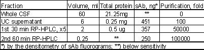 In normal human plasma and CSF the soluble amyloid beta protein (sAb) is associated with the high density lipoprotein (HDL) (Biochem Biophys Res Commun (1994) 205, 1164-1171). The aim of the present work was to develop simple protocol for isolation of sAb from the CSF-HDL. To this end HDL were first obtained by 60 h ultracentrifugation (UC) of the CSF at the density of 1.25 g/ml (39 g KBr per 100 ml of the CSF) and the sAb and apolipoproteins (apo) were fractionated by reverse phase (RP) HPLC on a C4 analytical column over the 30 min linear gradient of 20 to 80% acetonitrile in 0.1% TFA. The sAb and apo fractions obtained were characterized by SDS/PAGE, immunoblot and mass spectrometry. The following 60-min-RP-HPLC step yielded additional ~2 fold purification of the sAb. Once calibrated with anti-sAb antibodies (6E10, Senetek, PLC), the method (TABLE) can be used for the routine preparation of the native CSF sAb with no need for expensive antibodies.
